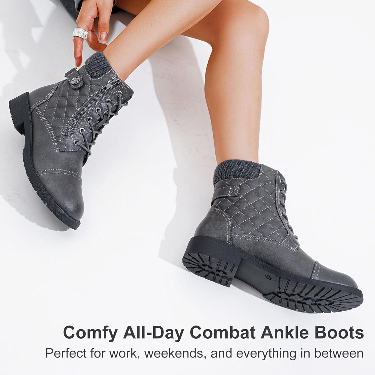 Vepose Women’s 903 Combat Ankle Boots, Lace up Comfortable Booties Low Heel(Grey Knitting-927)