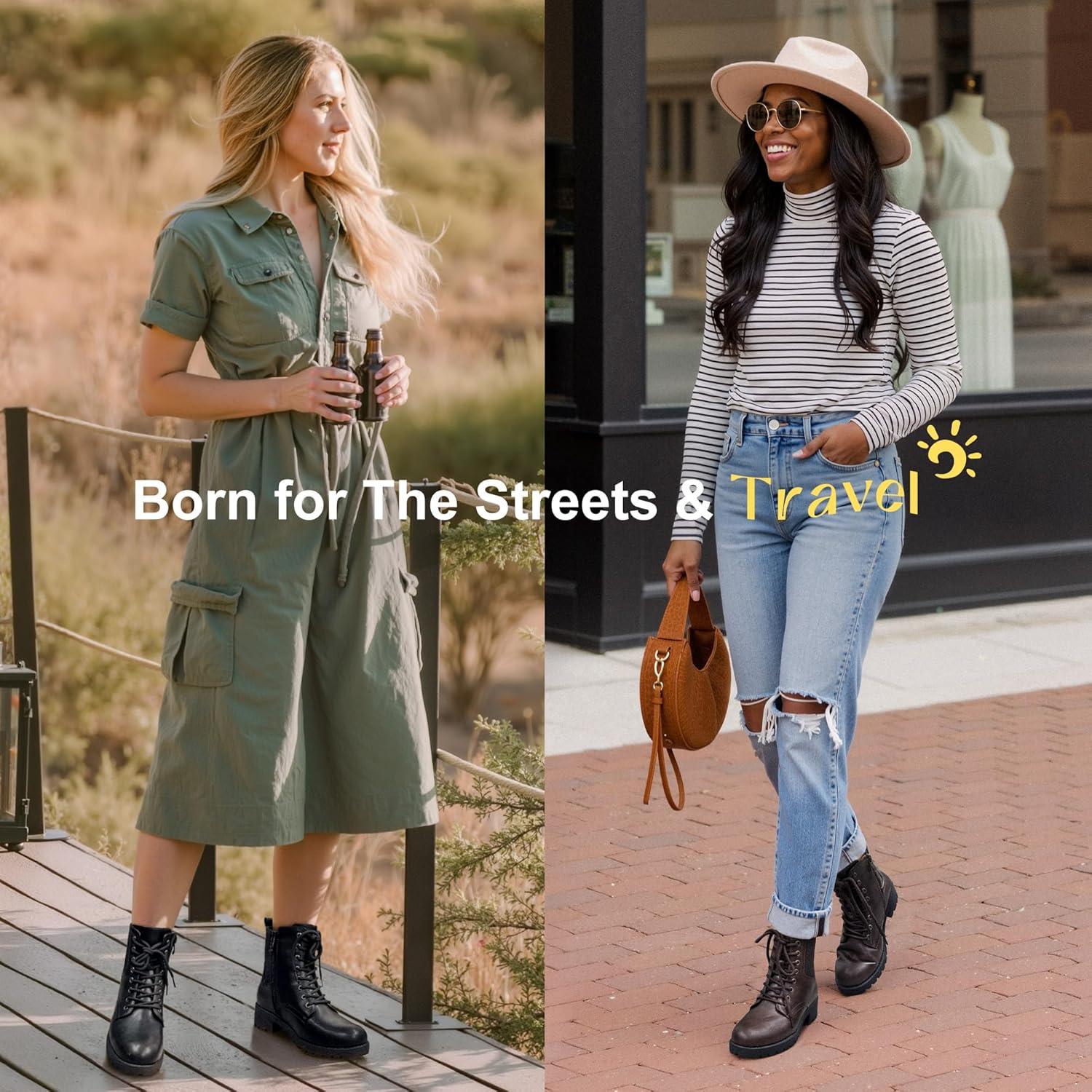Vepose Women’s 916 Ankle Boots, Combat Lace up Booties with Inside Zipper(Leather Black)