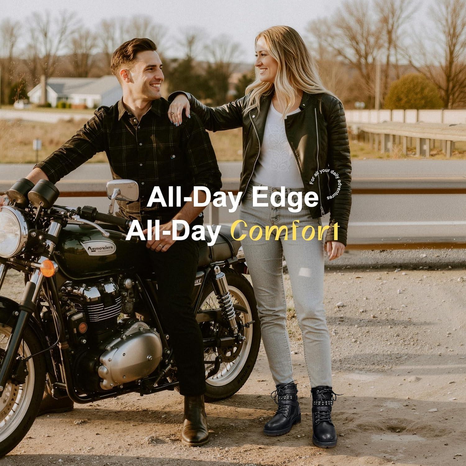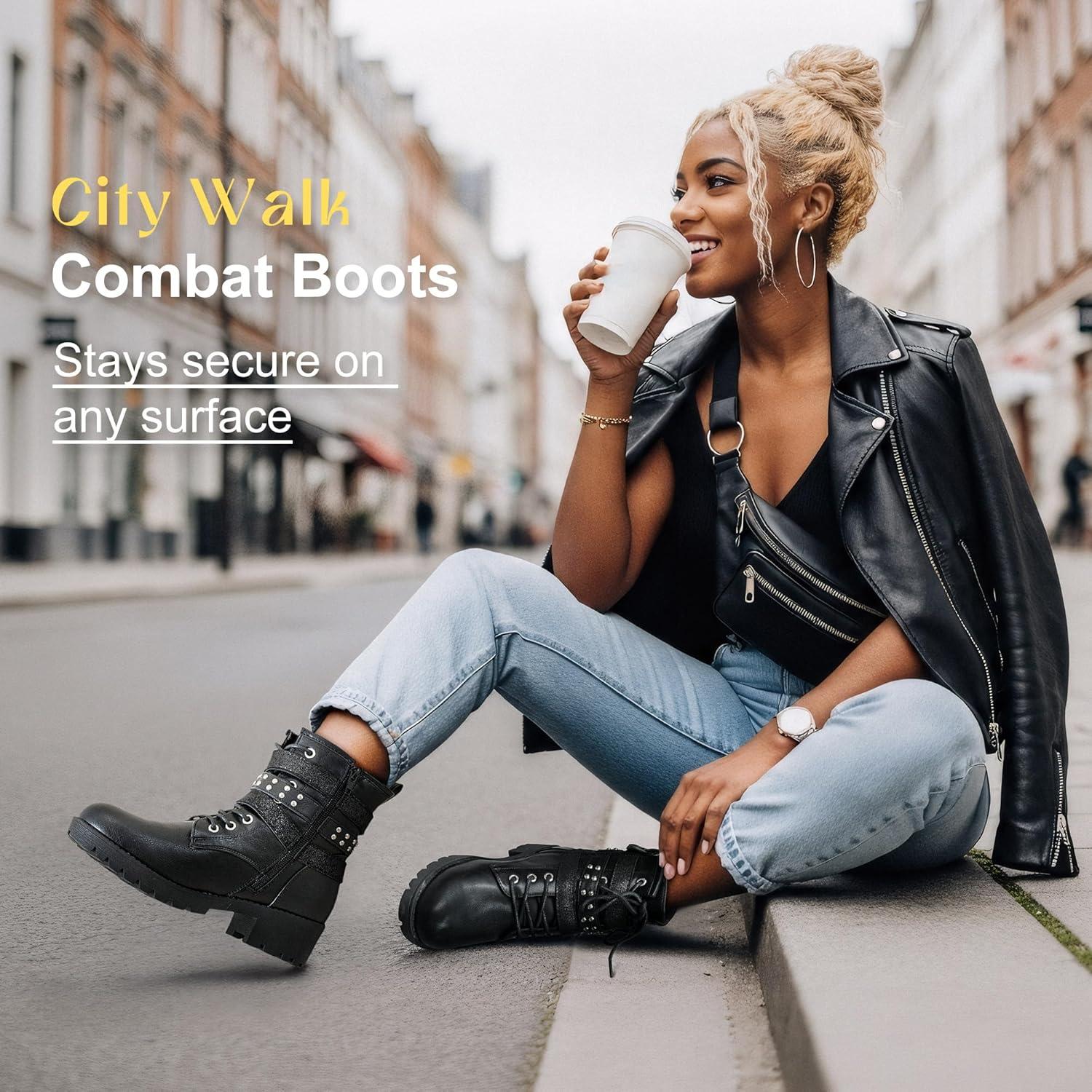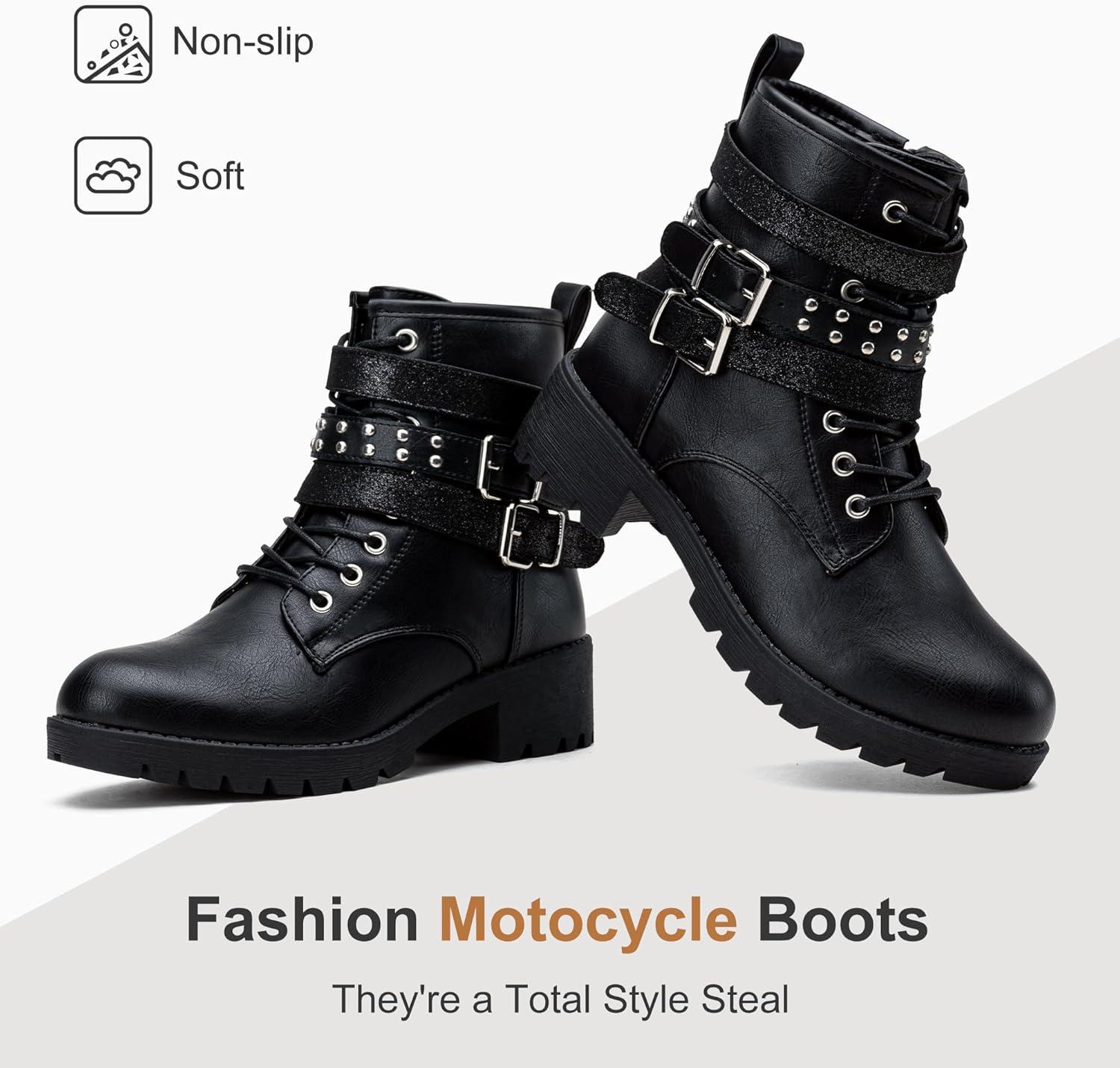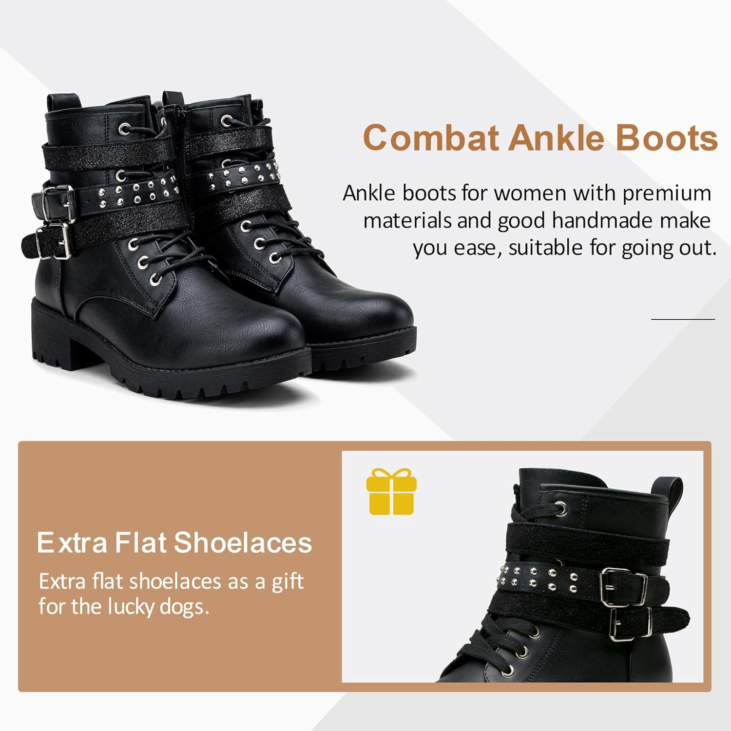 Vepose Women’s 916 Ankle Boots, Combat Lace up Booties with Inside Zipper(Moto Black)