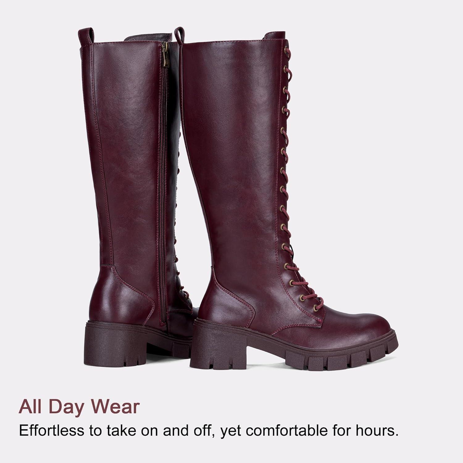 Vepose Women's 953 Knee High Combat Boots Chunky Platform Heel, Lace Up Gothic Punk Work Boots for Dresses and Jeans(Red Pu)