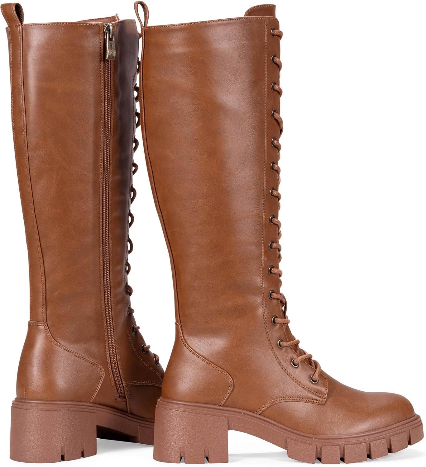 Vepose Women's 953 Lace Platform Combat Knee High Boots with Comfort Chunky Heel(Brown Pu)