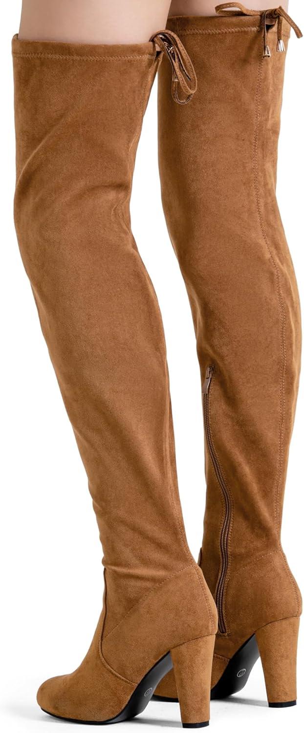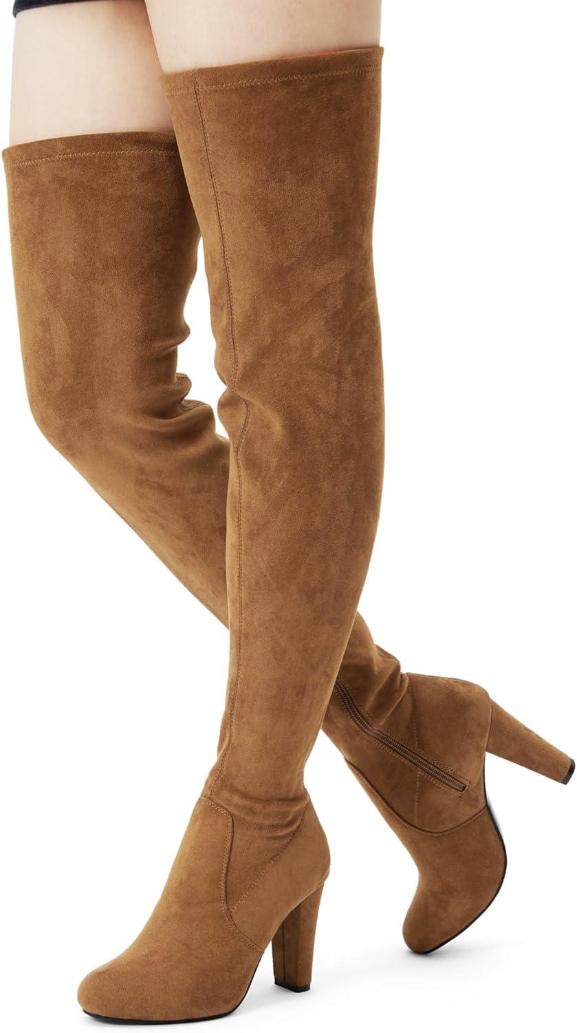 Vepose Women's Aria Thigh High Over The Knee Boots, Cute Suede Long Boots with High Heel and Inner Zipper(Camel Brown Suede)