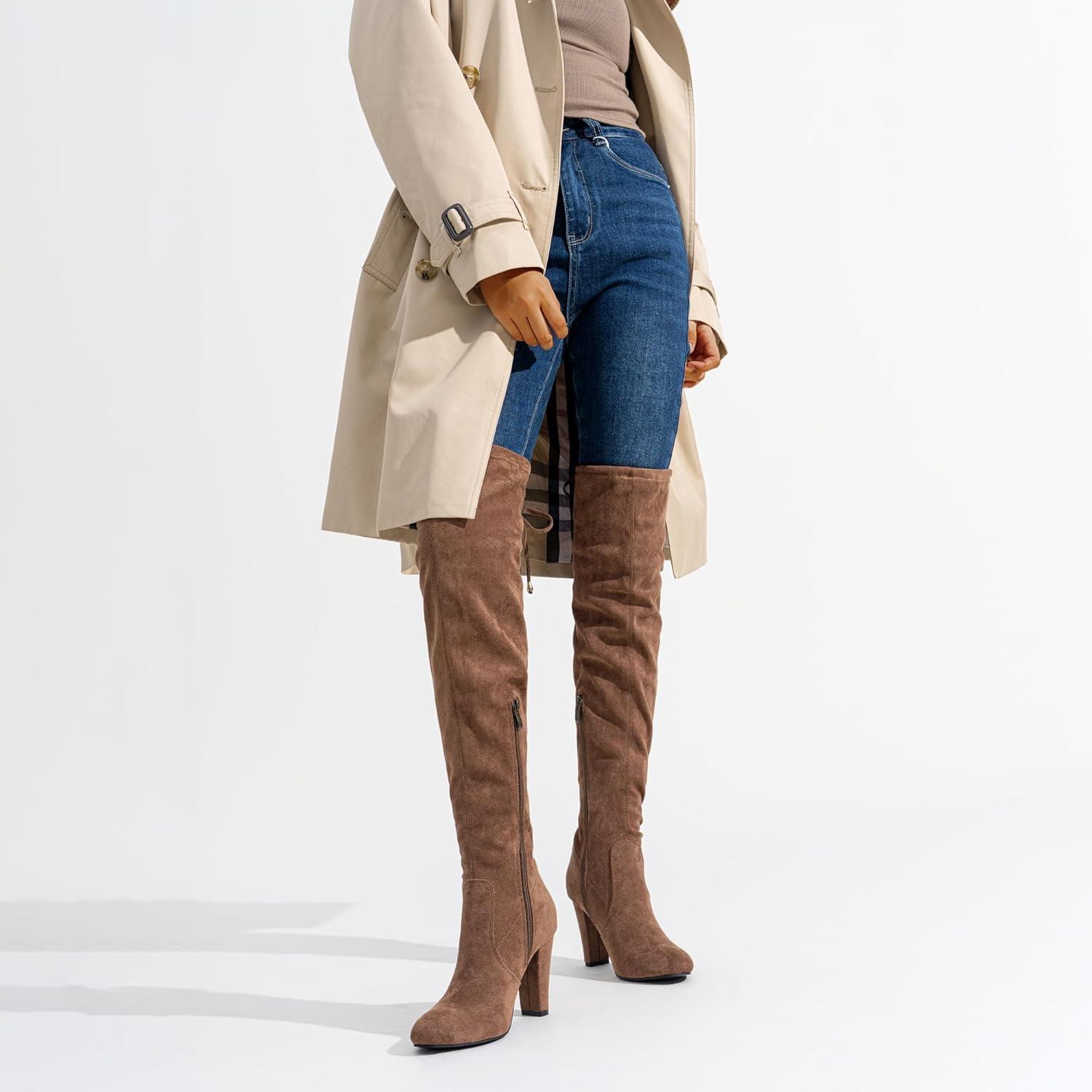 Vepose Women’s Aria Thigh High Over The Knee Boots, Cute Suede Long Boots with High Heel and Inner Zipper(Mocha Toffee Suede)