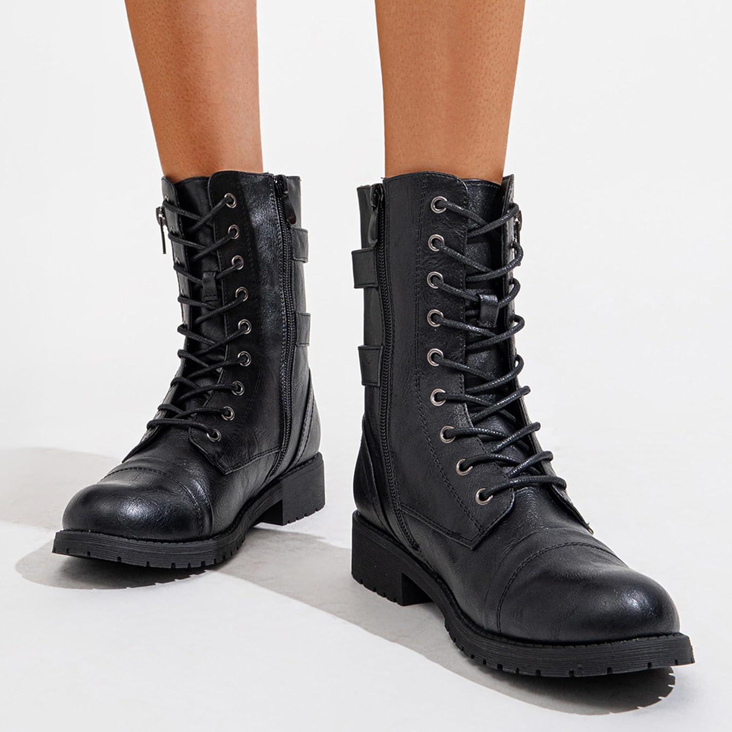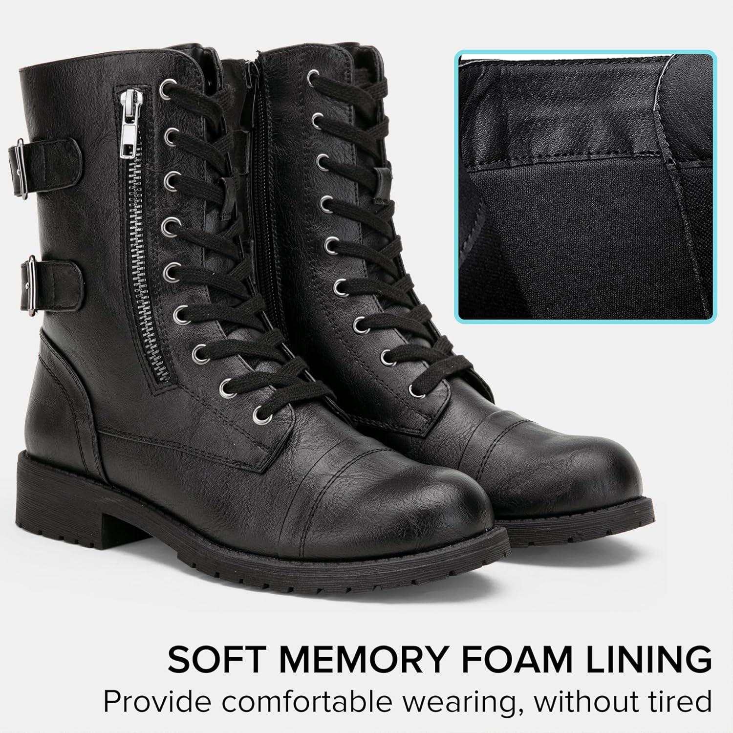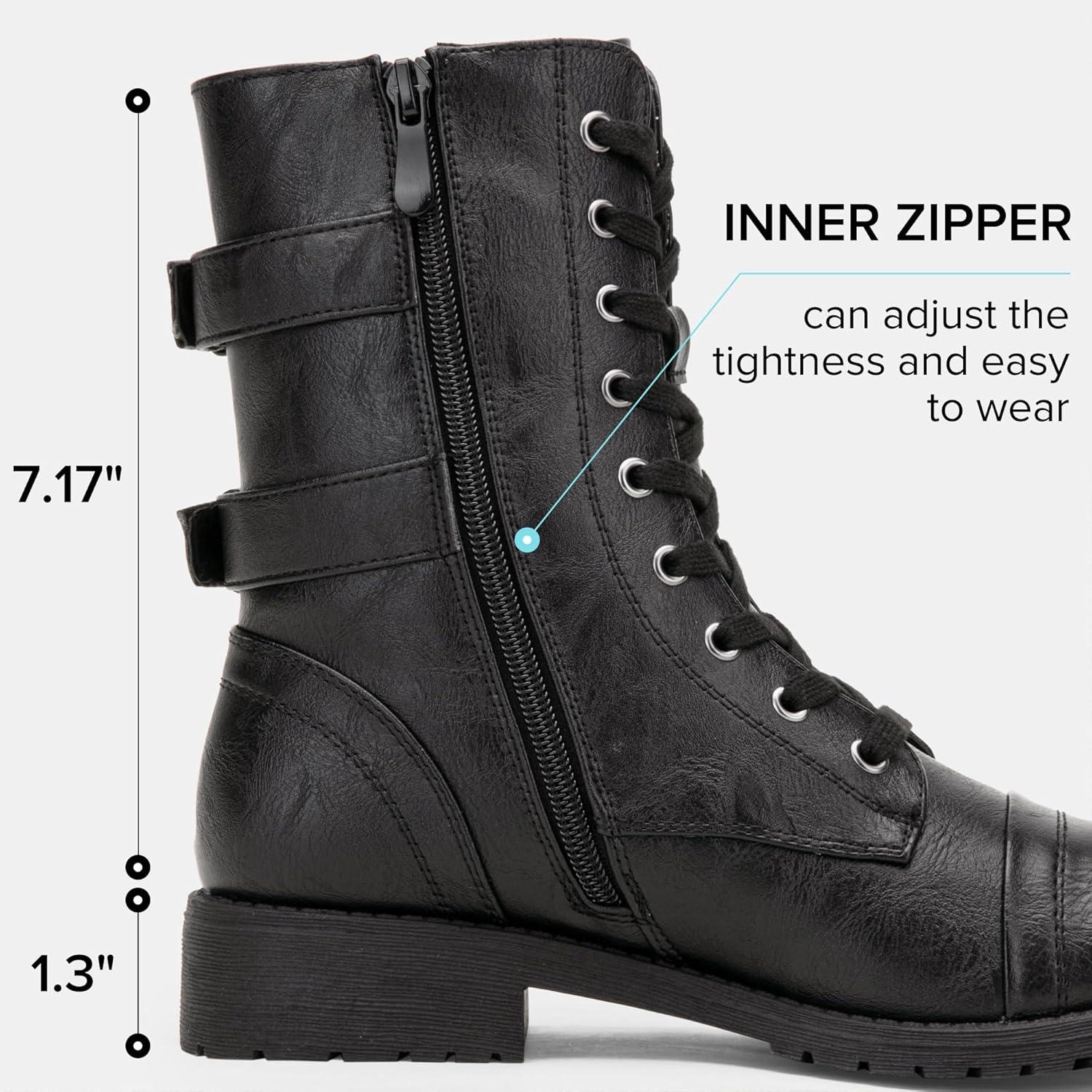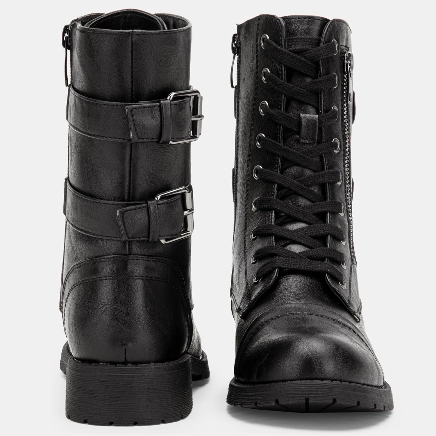 Vepose Women’s Combat Boots Low Heel, Mid Calf Military Boots with Card Knife Wallet Pocket(A-two Straps-black Pu)