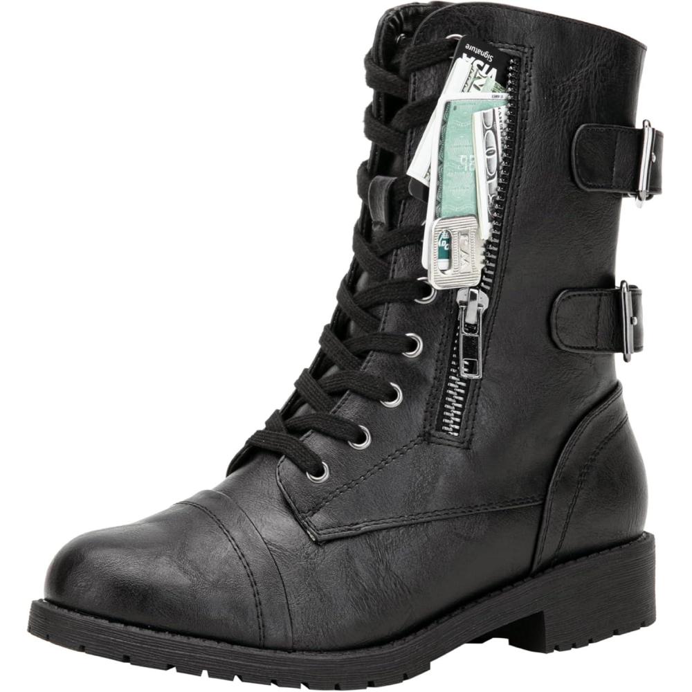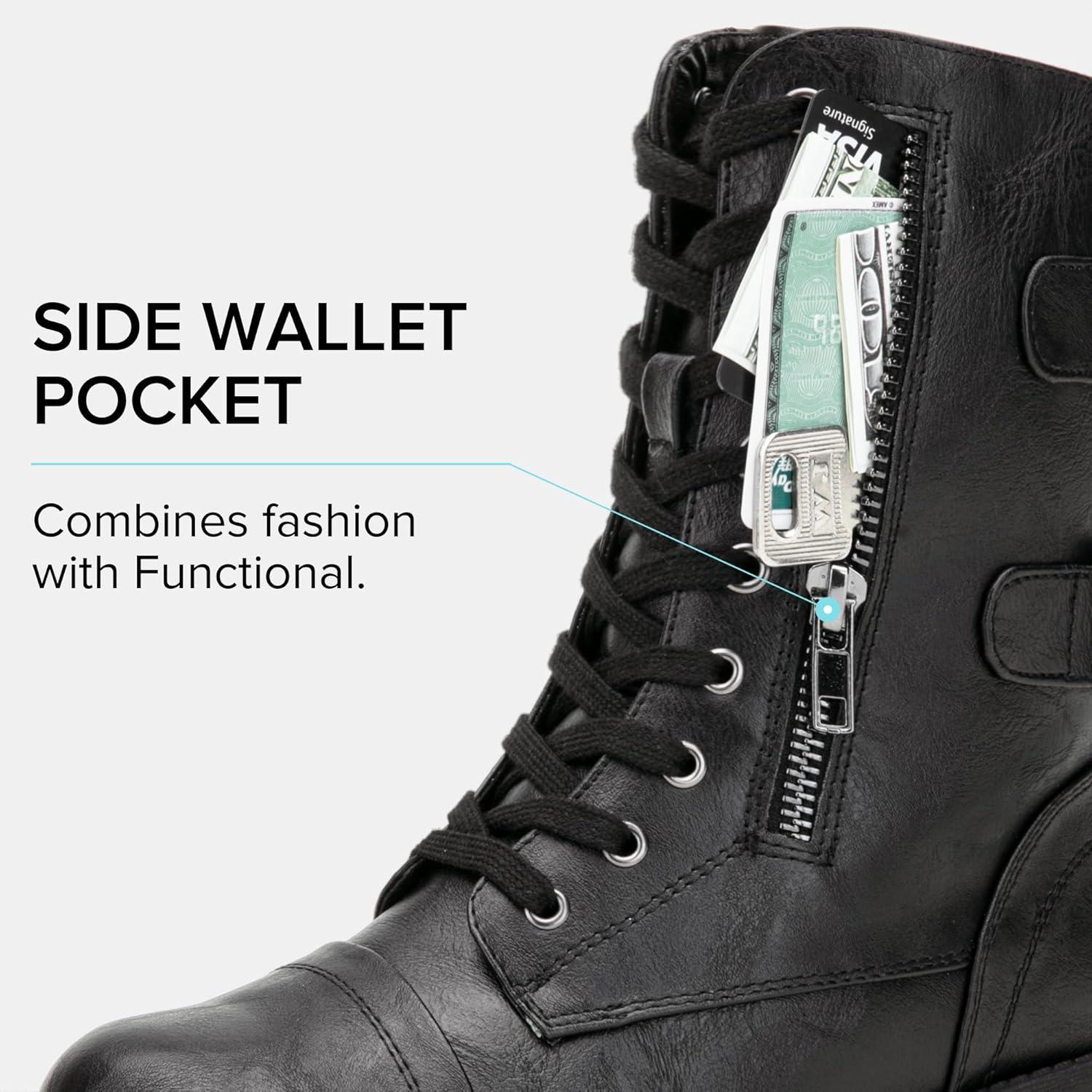 imageVepose Womens Combat Boots Low Heel Mid Calf Military Boots with Card Knife Wallet PocketBuckle Combatblack Pu