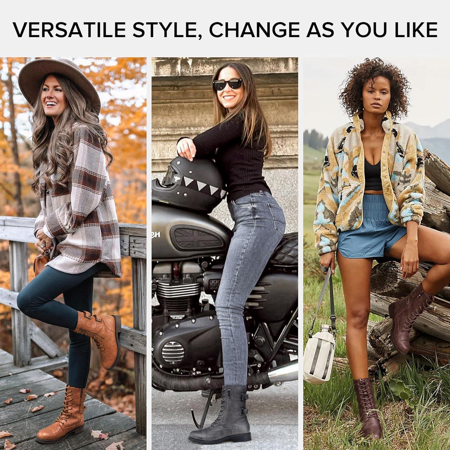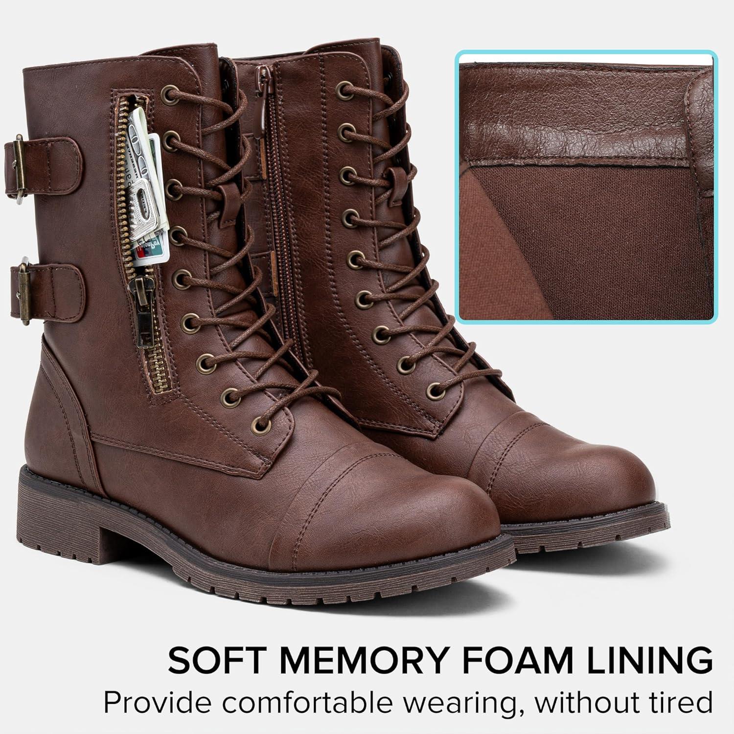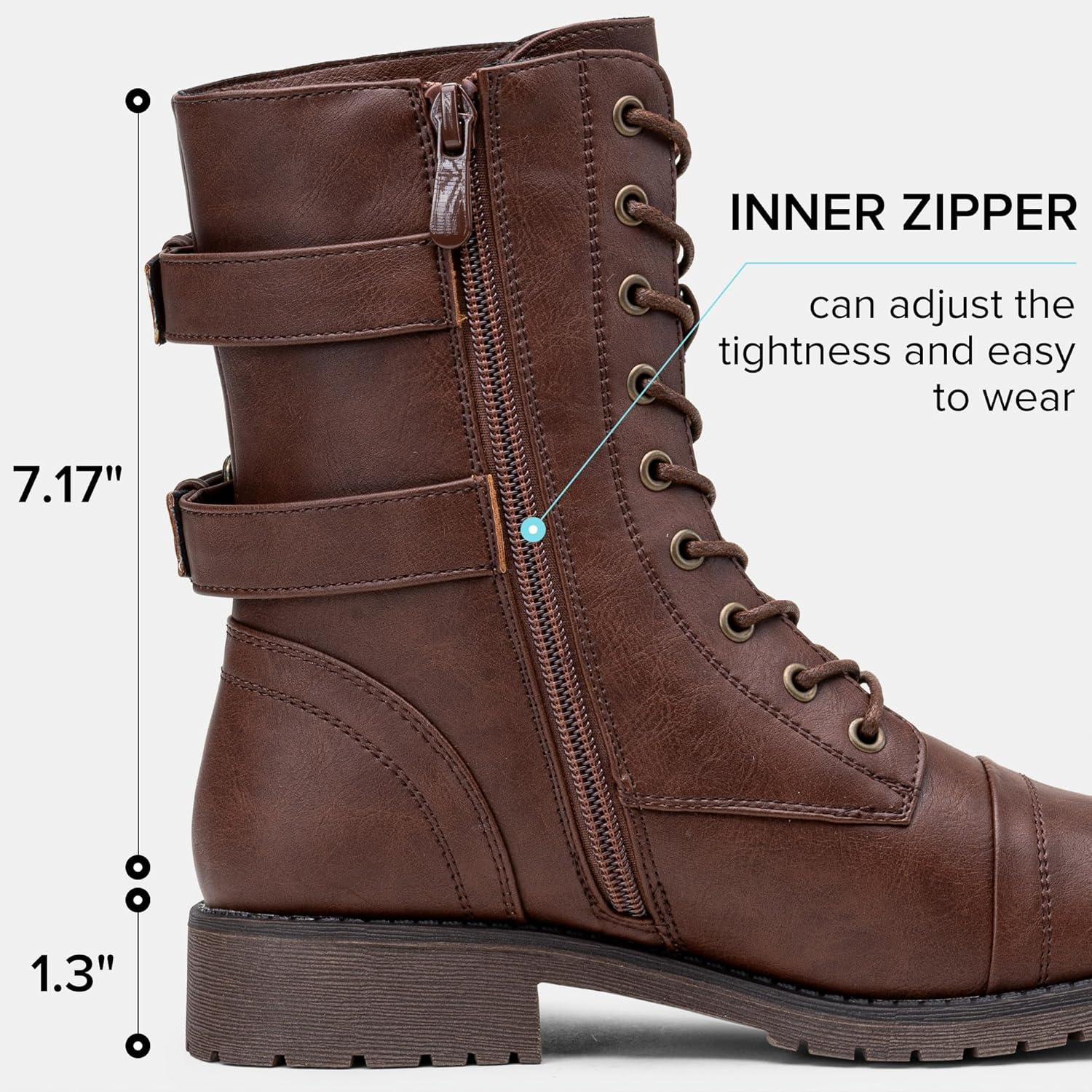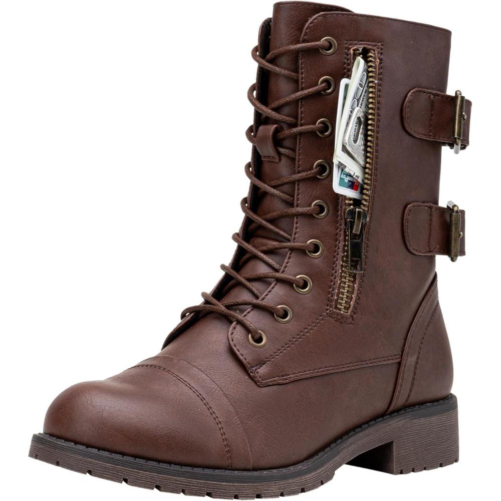 imageVepose Womens Combat Boots Low Heel Mid Calf Military Boots with Card Knife Wallet PocketHigh Combatbrown
