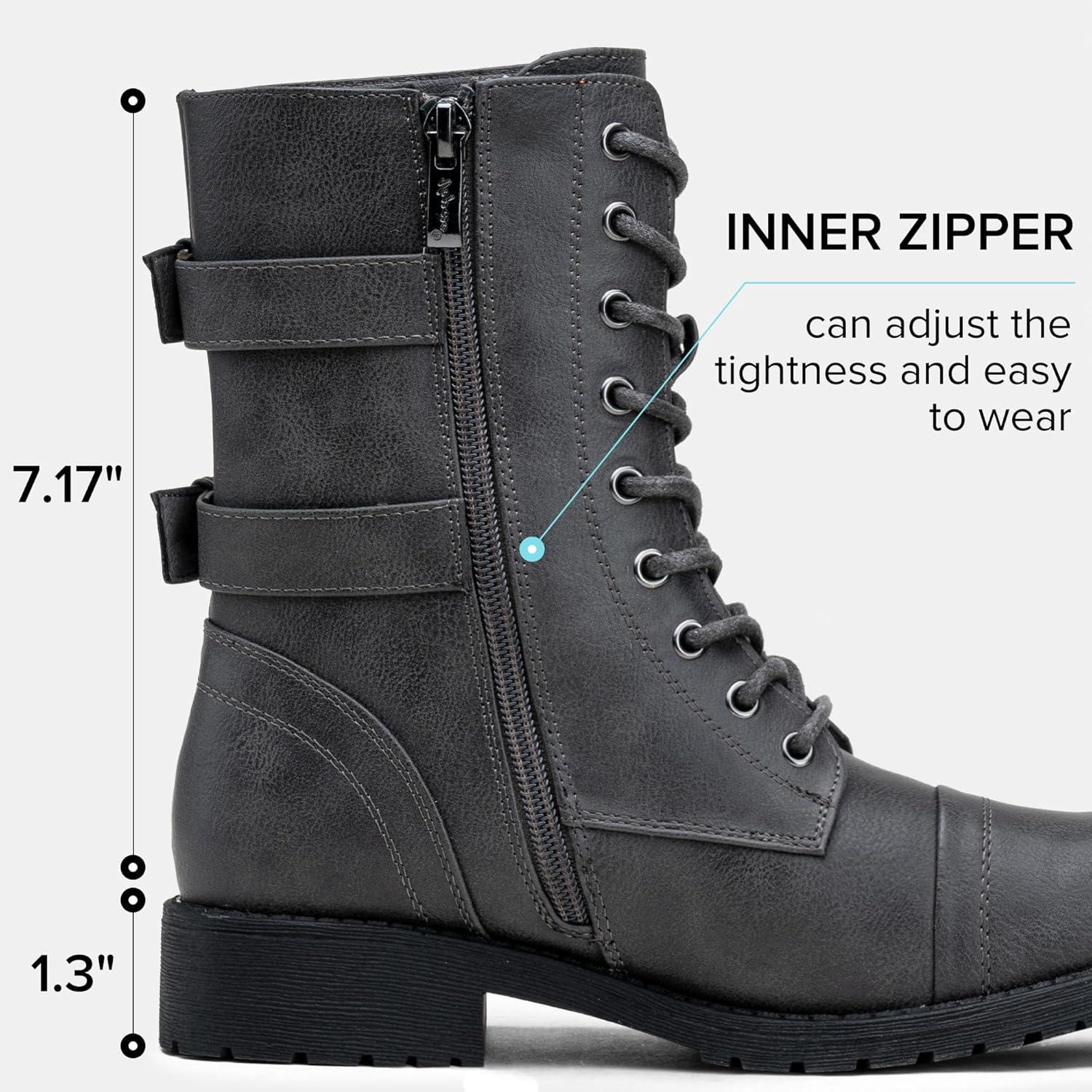 imageVepose Womens Combat Boots Low Heel Mid Calf Military Boots with Card Knife Wallet PocketHigh Combatgrey