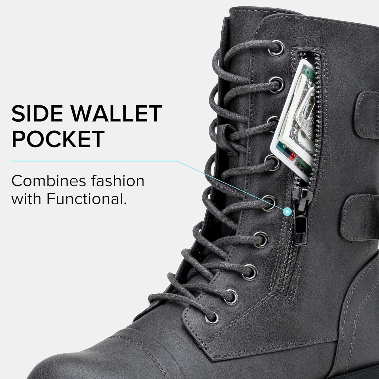 Vepose Women’s Combat Boots Low Heel, Mid Calf Military Boots with Card Knife Wallet Pocket(High Combat-grey)
